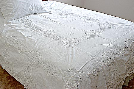 Old Fashion Style. Bed Covers & Bed Dust Ruffle All hand made battenburg lace White embroidery on white cotton. |  Bed Cover. Bed Skirt. Old Fashion Style Hand made battenburg lace bed coverlet |  Pillows Old Fashion Style Hand made battenburg lace design Available in 26" Square European Pillow Standard Pillow and King size pillow |